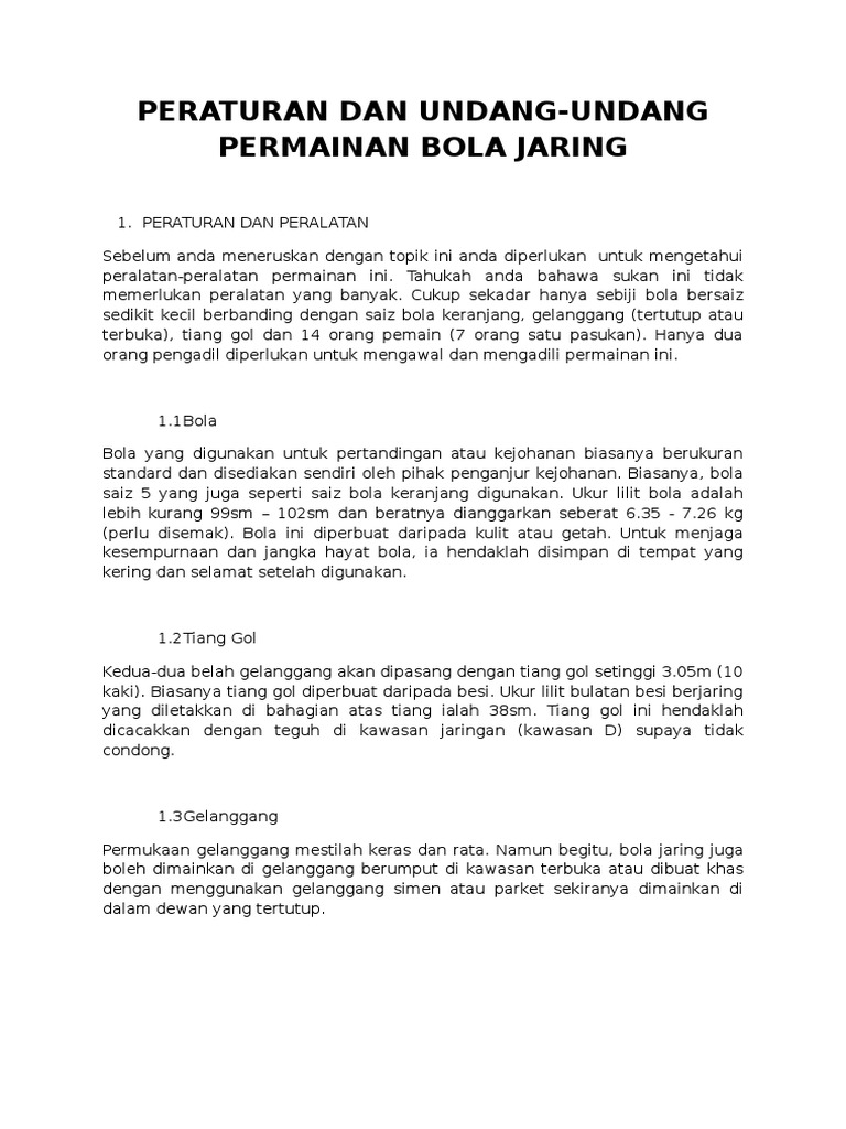 Olahraga ini bisa dimainkan di berbagai lokasi dan waktu selama ada lahan lapang. Sistem pindah bola Sebelum pertandingan dimulai harus ditentukan salah seorang pemain dari tiap-tiap pasangan sebagai orang pertama. Bola jaring netball adalah satu permainan yang direka oleh dan diubahsuai daripada permainan bola keranjangIa mula diperkenalkan di Amerika Syarikat pada tahun 1891 oleh Dr.