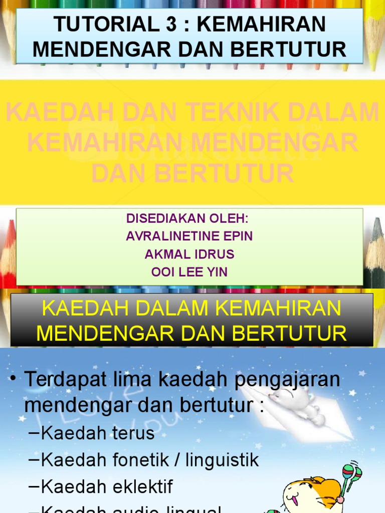 Cara meningkatkan kemahiran mendengar. Telah dimaklumkan bahawa kemahiran lisan mendengar dan bertutur dapat diajar melalui dua pendekatan iaitu pendekatan situasi yang mementingkan penyebutan unsur-unsur bunyi bahasa atau kecekapan bahasa tatabahasa. Kemahiran mendengar dan bertutur merupakan kemahiran utama yang perlu dikuasai oleh pelajar. Anda juga boleh memasukkan ahli keluarga lain.