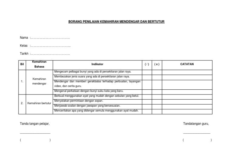 Borang Penilaian Kemahiran Mendengar Dan Bertutur Pdf
