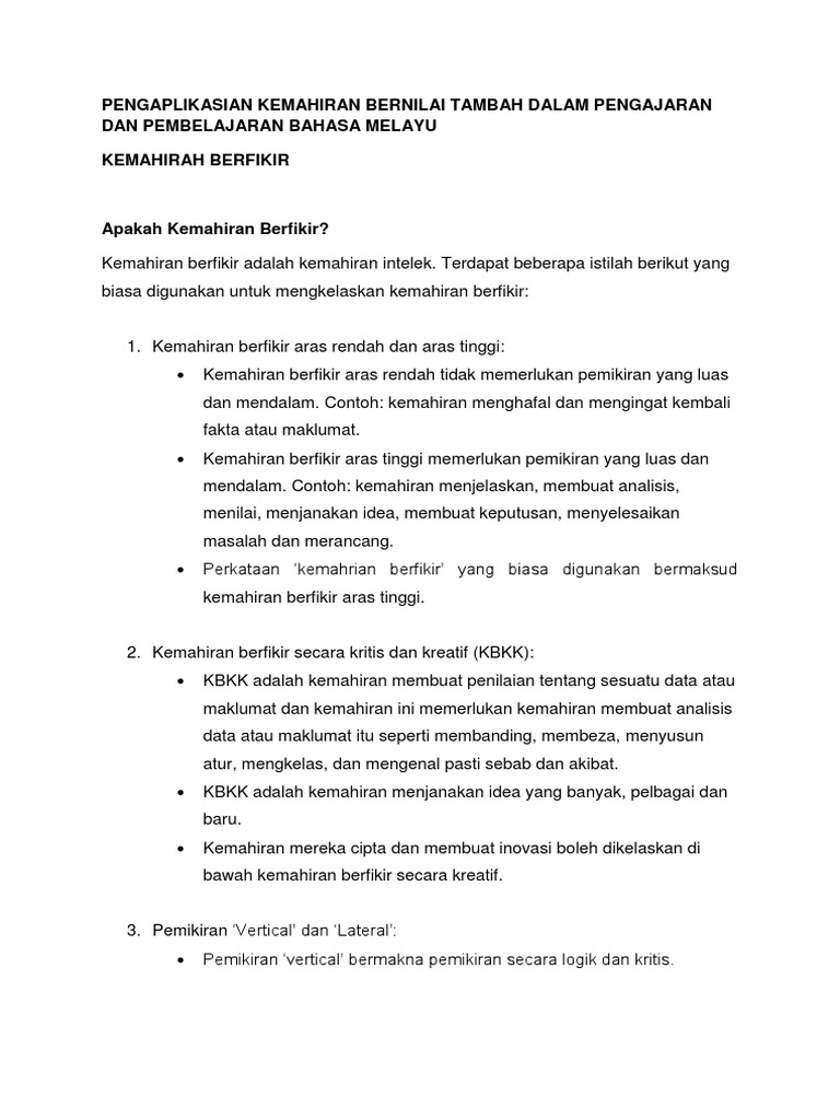 Apakah Jenis Kemahiran Berfikir Terdapat pelbagai jenis kemahiran berfikir mengikut pandangan dan aliran pemikiran yang dikemukakan oleh ahli-ahli pemikir dan penulis-penulis dalam bidang berkenaan. 10 PENGENALAN Apakah maksud alat berfikir. Lebih mudah untuk mengingat apabila ia ditunjukkan perkaitan konsep.