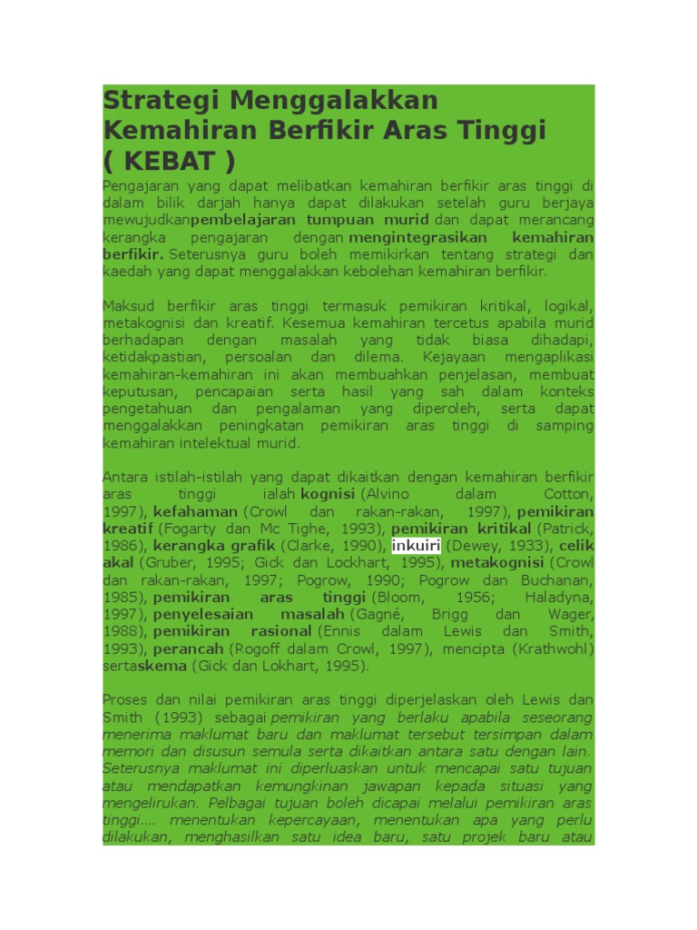 Dr SAEMAH Created Date. Semoga dengan perkongsian ini mampu memberikan guru sedikit pencerahan mengenai kaedah dan strategi yang boleh digunapakai dalam menerapkan kemahiran berfikir aras tinggi KBAT dalam kalangan pelajar. Kemahiran Berfikir Aras Tinggi HOTS 1.
